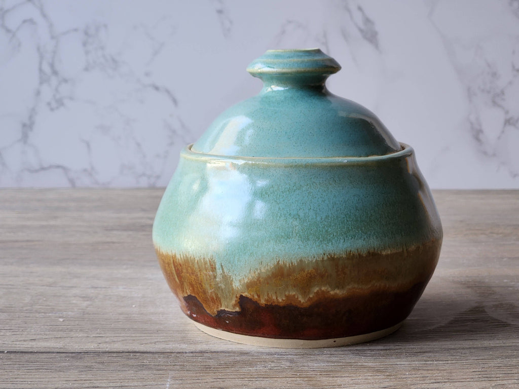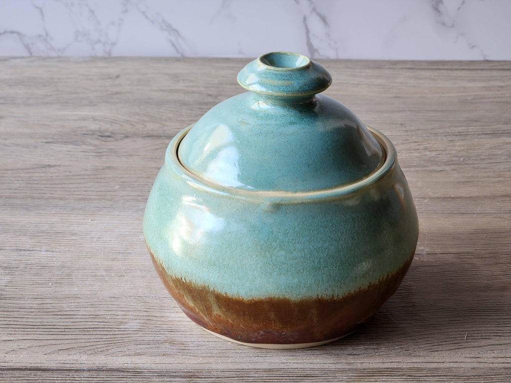 Handmade Pottery Sugar Bowl with Lid | Green Brown Ceramic Canister