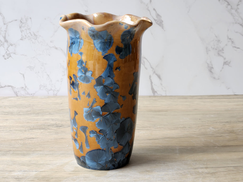 This handmade ceramic vase is an artful blend of science and beauty, crafted in fine porcelain and finished with a breathtaking crystalline glaze. The vibrant orange base is adorned with striking blue crystals that grow naturally during firing, making this piece truly one-of-a-kind.
