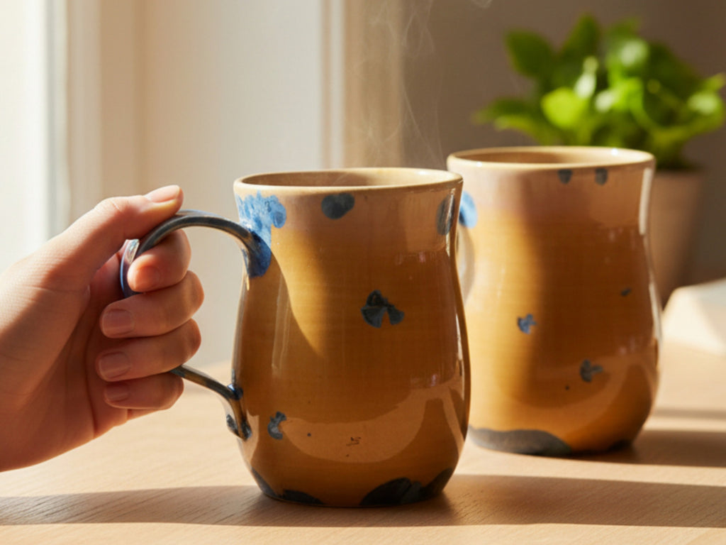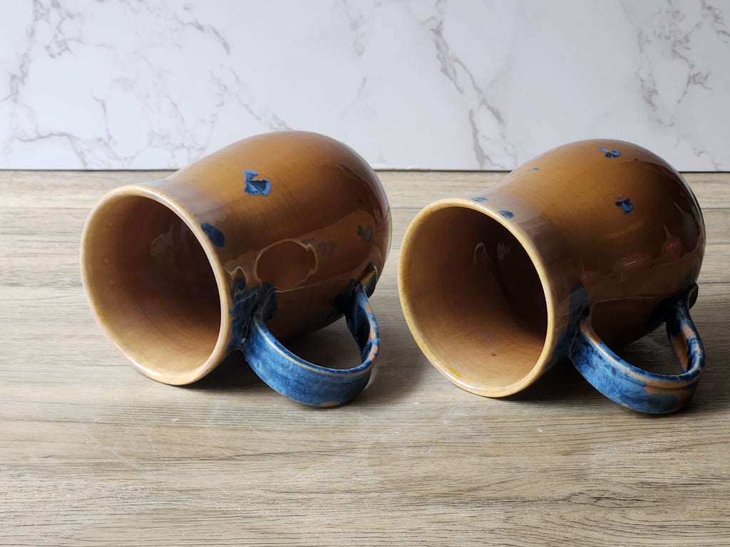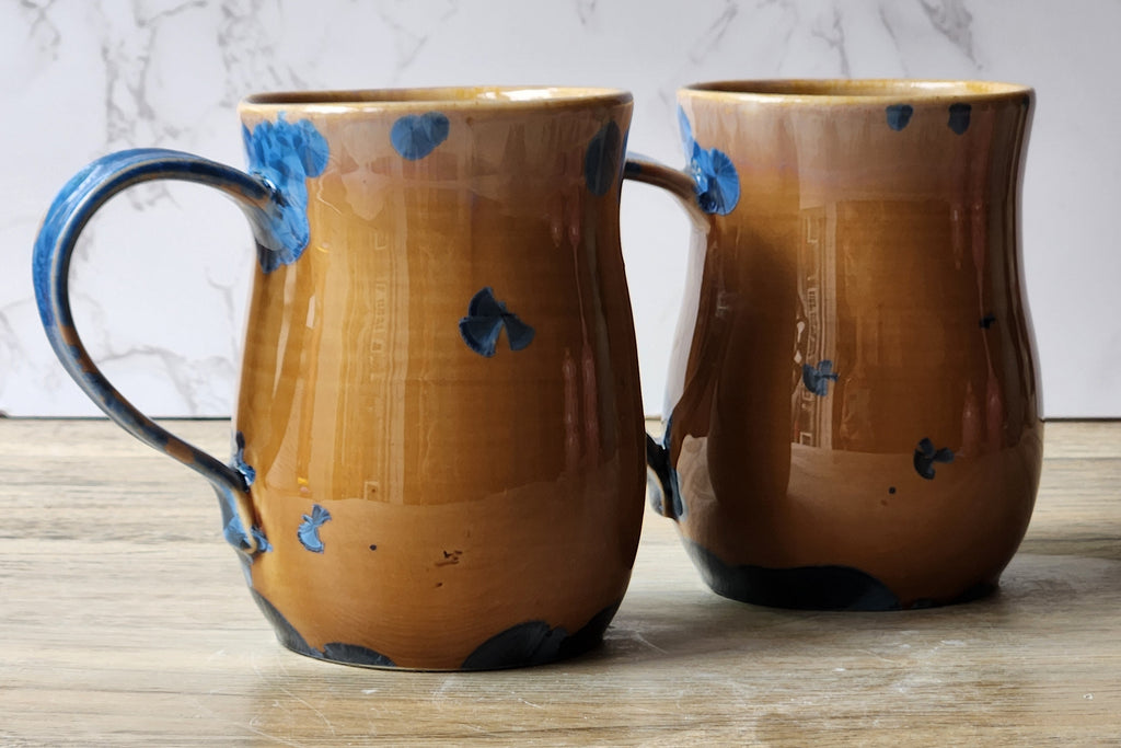 Handmade Pottery Mugs – Crystalline Glaze Duo | 400ml | Blue on Amber | Unique Australian Ceramics
