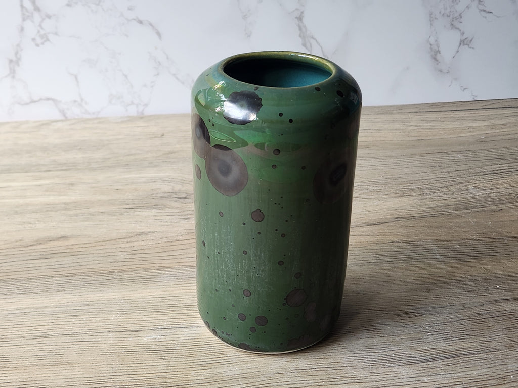 The green and blue glaze showcases natural crystal growth that forms during the firing process, creating one-of-a-kind patterns across the vase’s surface. No two pieces are ever the same, making this vase a true original work of art.