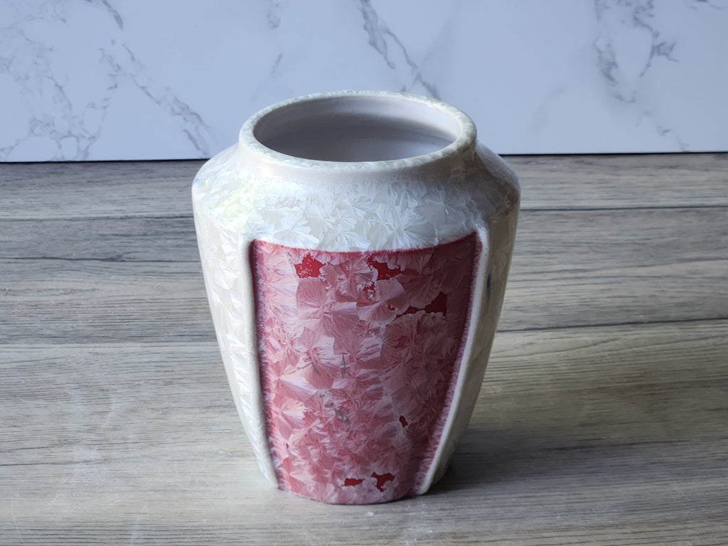 This small red crystalline vase is wheel-thrown and finished in a striking red glaze with soft white crystals. These crystals grow naturally in the firing process, creating floating, flower-like blooms that make every piece absolutely one-of-a-kind.