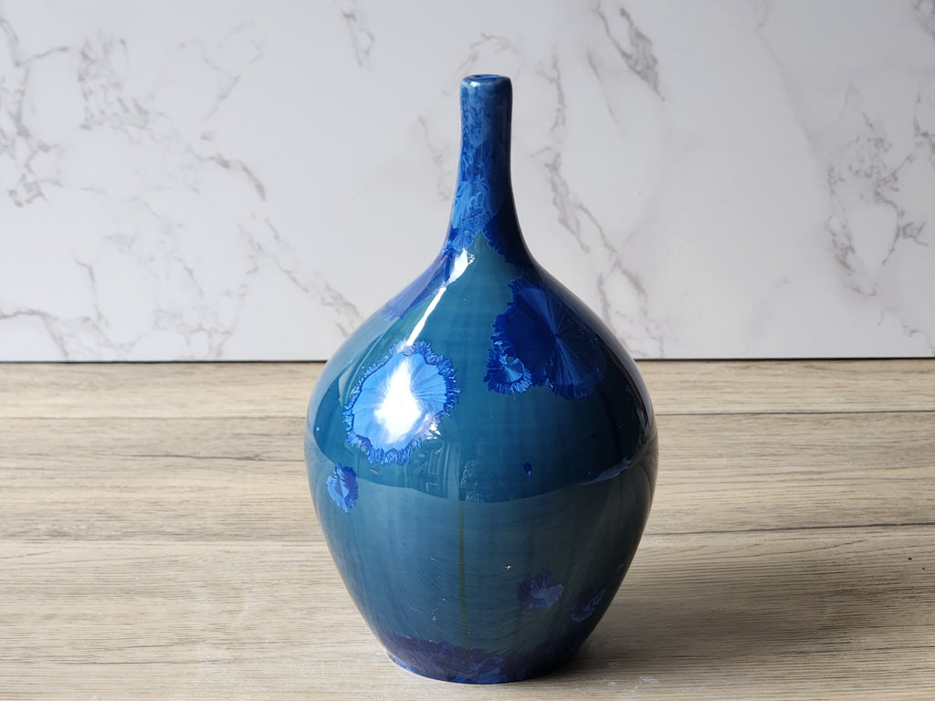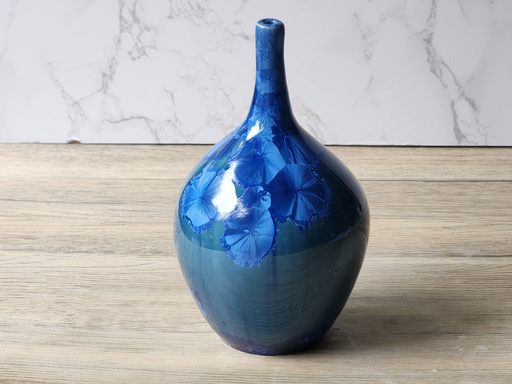 The vibrant sapphire glaze reveals large, intricate crystals, formed naturally during an exact firing schedule and slow controlled cooling. Because crystals grow unpredictably, no two crystalline pieces can ever be replicated, making this vase a unique collectible.