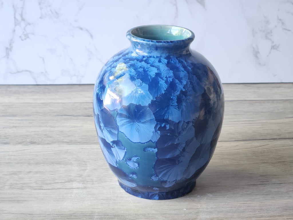 The vibrant sapphire glaze reveals large, intricate crystals, formed naturally during an exact firing schedule and slow controlled cooling. Because crystals grow unpredictably, no two crystalline pieces can ever be replicated, making this vase a unique collectible.