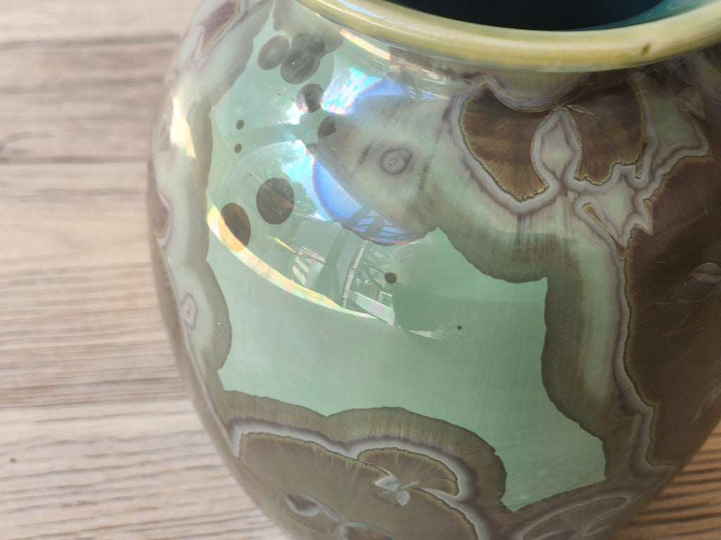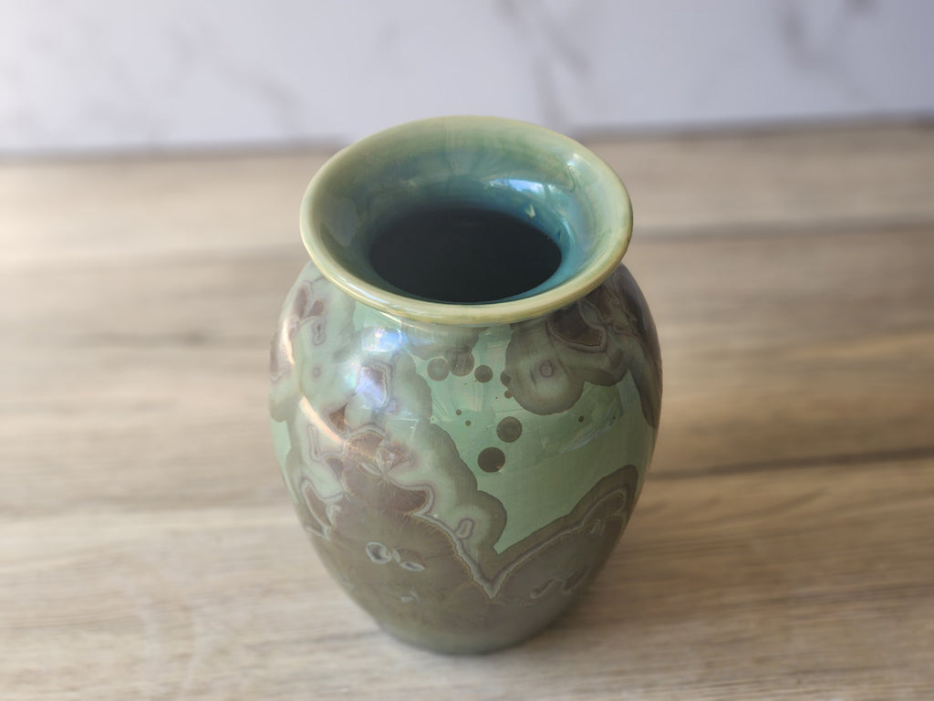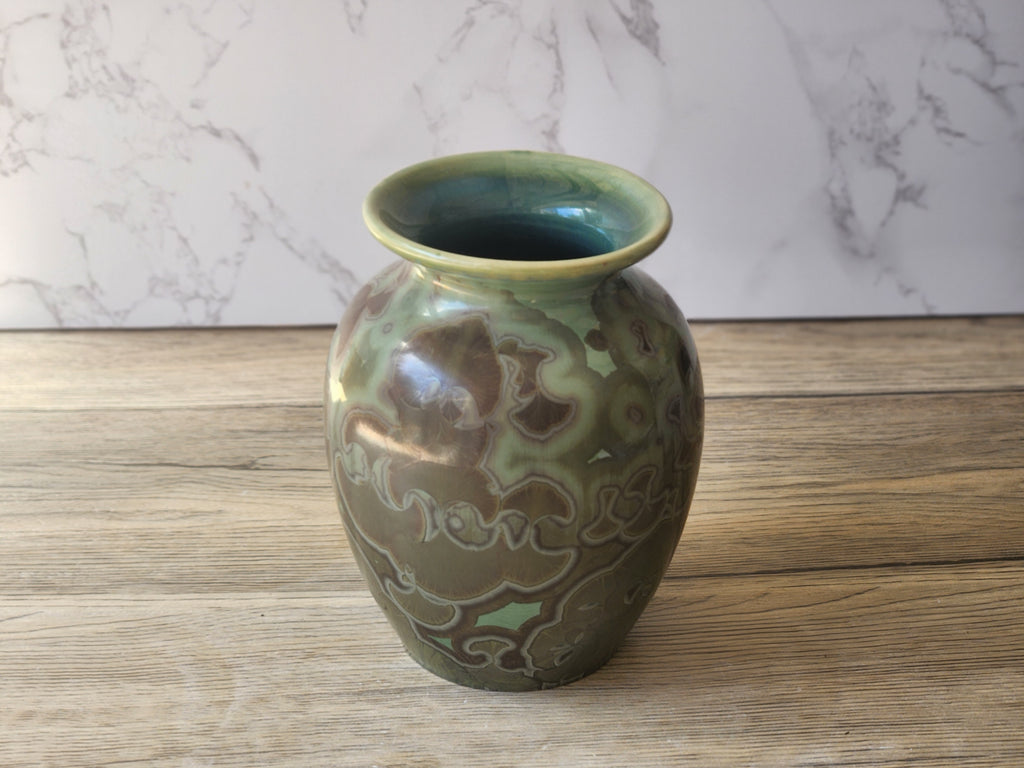 The green and blue glaze showcases natural crystal growth that forms during the firing process, creating one-of-a-kind patterns across the vase’s surface. No two pieces are ever the same, making this vase a true original work of art.