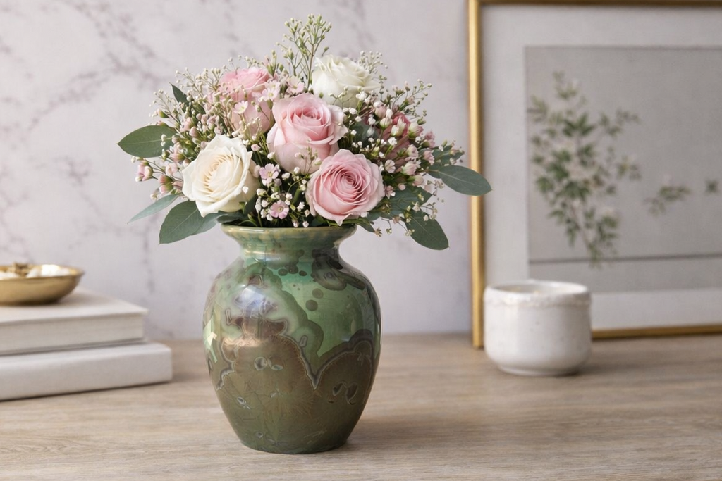 Each vase is wheel-thrown and hand-glazed in our Melbourne studio. The crystalline finish is one of the most advanced ceramic techniques, where crystals naturally grow during the firing process—making every piece completely unique.