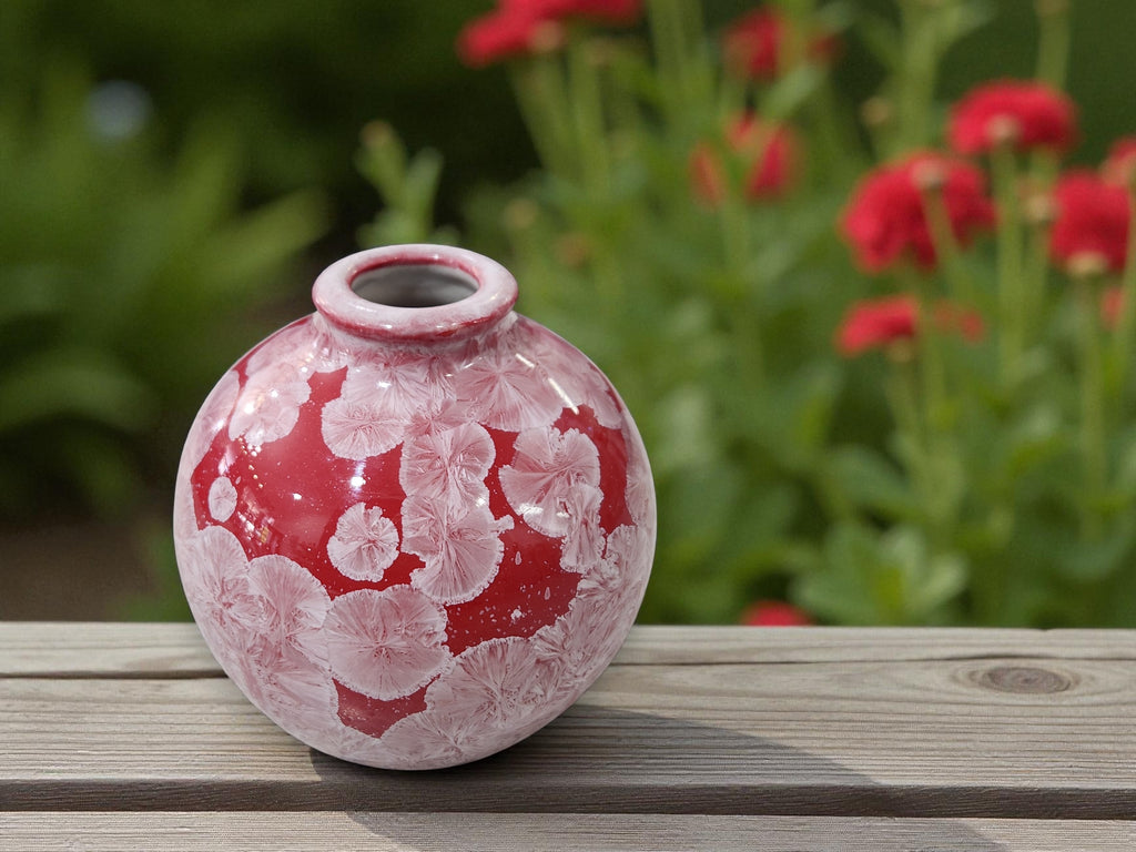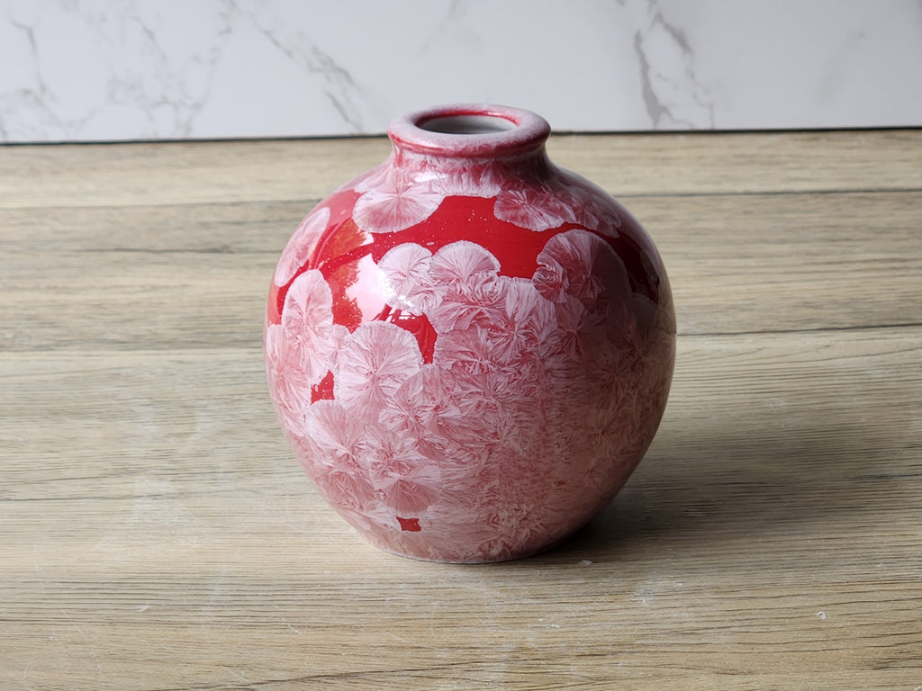 This small red crystalline vase is wheel-thrown and finished in a striking red glaze with soft white crystals. These crystals grow naturally in the firing process, creating floating, flower-like blooms that make every piece absolutely one-of-a-kind.