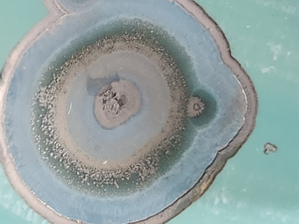 The small raised area on the rim is a natural result of the crystalline firing process, in which an excess of zinc and silica has gathered to form the crystal structure.