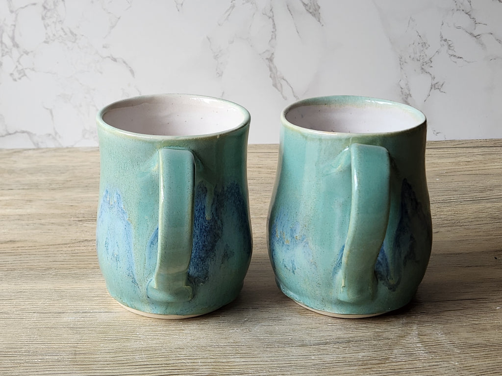 Handmade in our Melbourne studio, this large ceramic coffee mug is wheel-thrown from strong stoneware clay and glazed in rich layers of tmint green with flecks of light blue. The glossy white interior contrasts beautifully, creating a natural, earthy landscape effect.